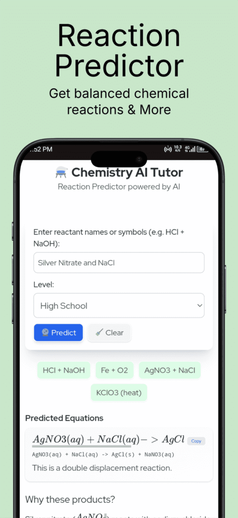 Type in your reactants, and let Vortex AI predict and balance the complete chemical equation, explaining the process and key concepts behind every reaction. Perfect for chemistry learners at all levels.