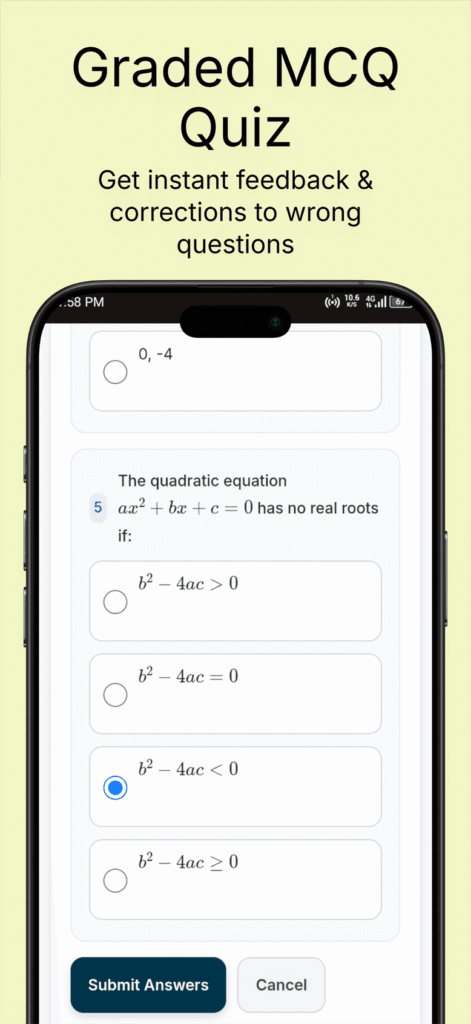 The MCQ practice quiz is amazing. I asked for calculus questions and it generated practice sets instantly, with corrections that helped me learn from my mistakes.