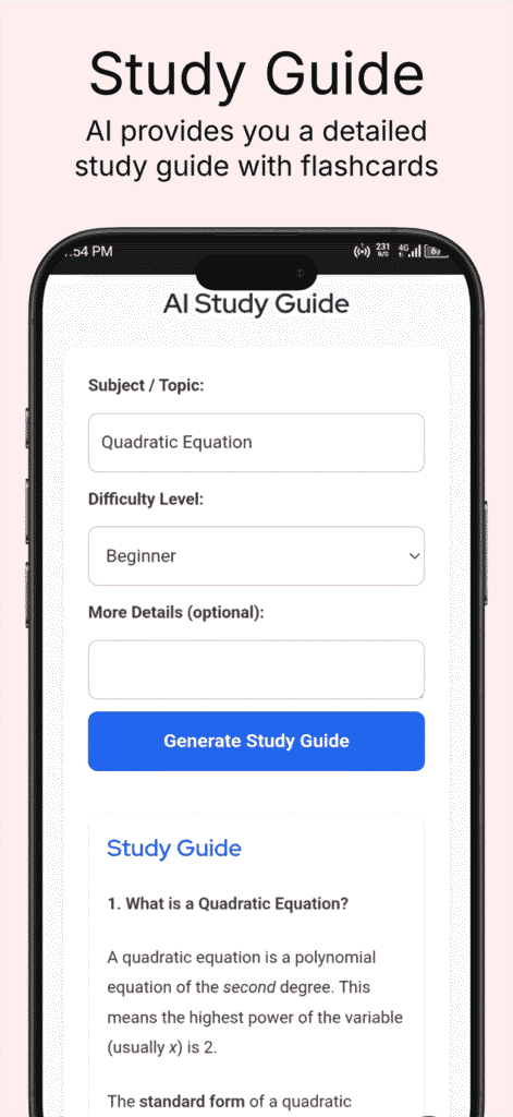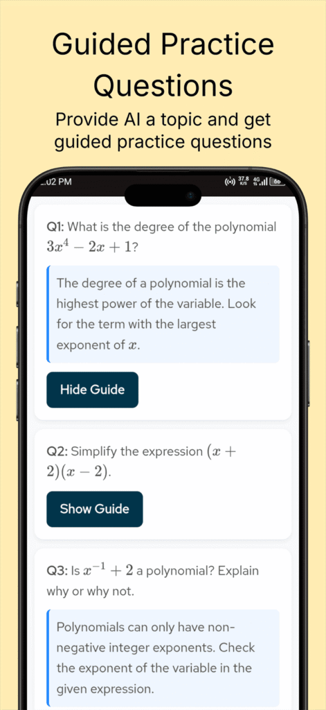 Yes! The app has a study guide, guided practice questions and an MCQ practice section where AI creates practice questions on your chosen topic, grades your answers, and gives corrections.