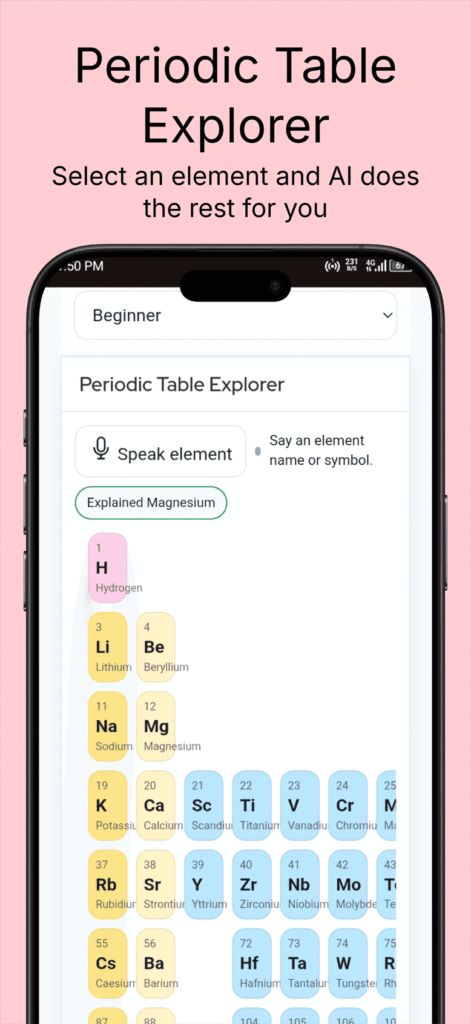 Explore the elements like never before. Tap on any element to discover its properties, atomic structure, uses, and more — or chat with the AI to dive deeper into chemical concepts in real time.